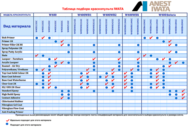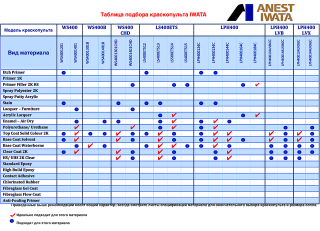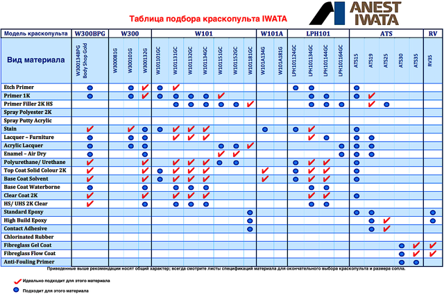 Для майстрів у яких постало питання про вибір фарбопульта Iwata і немає часу читати форуми, нижче наведено оригінальні таблиці Івата - підбір фарбопульта в залежності від використовуваного матеріалу.