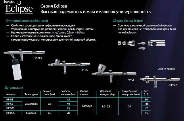 Iwata HP-BS аерограф подвійної незалежної дії. Максимально економне використання кількості фарби досягається завдяки гравітаційній поданні, а невеликий об'єм не обважнює апарат під час роботи. Сопло і бачок невеликого розміру робить цю модель просто незамінною і використовується для всіх типів робіт, починаючи нанесенням фонового малюнка та закінчуючи деталізацією.